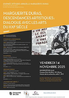 Nous avons le plaisir de vous convier à la journée d'études annuelle Marguerite Duras qui portera sur « Marguerite Duras, descendances artistiques : dialogue avec les arts du XXIe siècle » organée par Laurent Camerini et Florence de Chalonge. Vous trouverez le programme en pièce jointe.