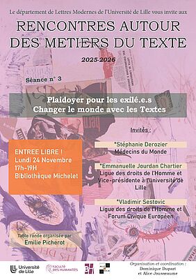 Nous avons le plaisir de vous convier à la deuxième séance des Rencontres autour des métiers du texte, qui portera sur plaidoyer pour les exilé·e·s, changer le monde avec les Textes, en présence de Stéphanie DEROZIER, Emmanuelle JOURDAN CHARTIER et Vladimir SESTOVIC.